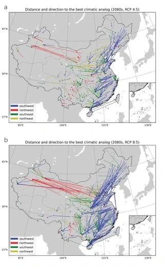 Distance and direction to the best climatic analog under (a) RCP4.5 and (b) RCP8.5 in the 2080s.Abstract